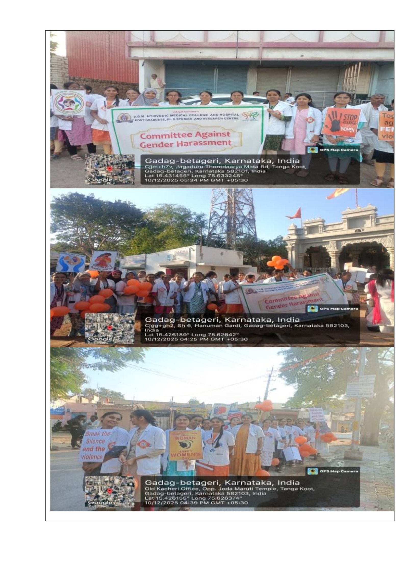 10.12.2025,The Human Grievance & Redressal Cell and Committee Against Gender Harassment of D.G.M. Ayurvedic Medical College & Hospital, Gadag, in association with the Inner Wheel Club, Gadag–Betageri, and various local women’s organizations, successfully organized a Women Atrocity Prevention and Awareness Walkathon on 10th December 2025 at 4:00 PM. The programme was conducted with the objective of creating awareness about women’s safety, gender equality, and the prevention of gender-based violence. The walkathon commenced from Shri Joda Maruthi Temple, Gadag, with active participation from nearly 120 students, faculty members, volunteers, and representatives of women’s organizations. Carrying banners and placards with awareness messages, the rally passed through prominent locations of the city including Basaveshwar Circle, Namajoshi Road, Tanga Koota, and Mahendrakara Circle, before concluding at Tontadarya Math. During the walkathon, participants raised slogans and interacted with the public, effectively spreading awareness among the local community. The programme concluded at Tontadarya Math with a benedictory address by His Holiness Trividha Dasohi Jagadguru Sri Sri Tontada Siddharam Swamiji, who emphasized the collective social responsibility in protecting women and the importance of education, awareness, and moral values in preventing atrocities against women. The event successfully reinforced the message of dignity, safety, and justice for women in society.. |