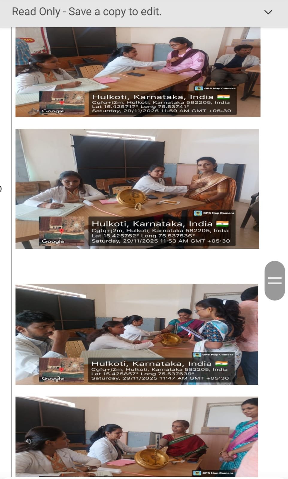 29/11/2025, The free health check-up and medicine distribution was organised at Hulkoti,Gadag, by Department of Panchakarma Faculties Dr.Rohini.R.Patil PG’S Dr.Chaitra Internees Dr.Abhishek |