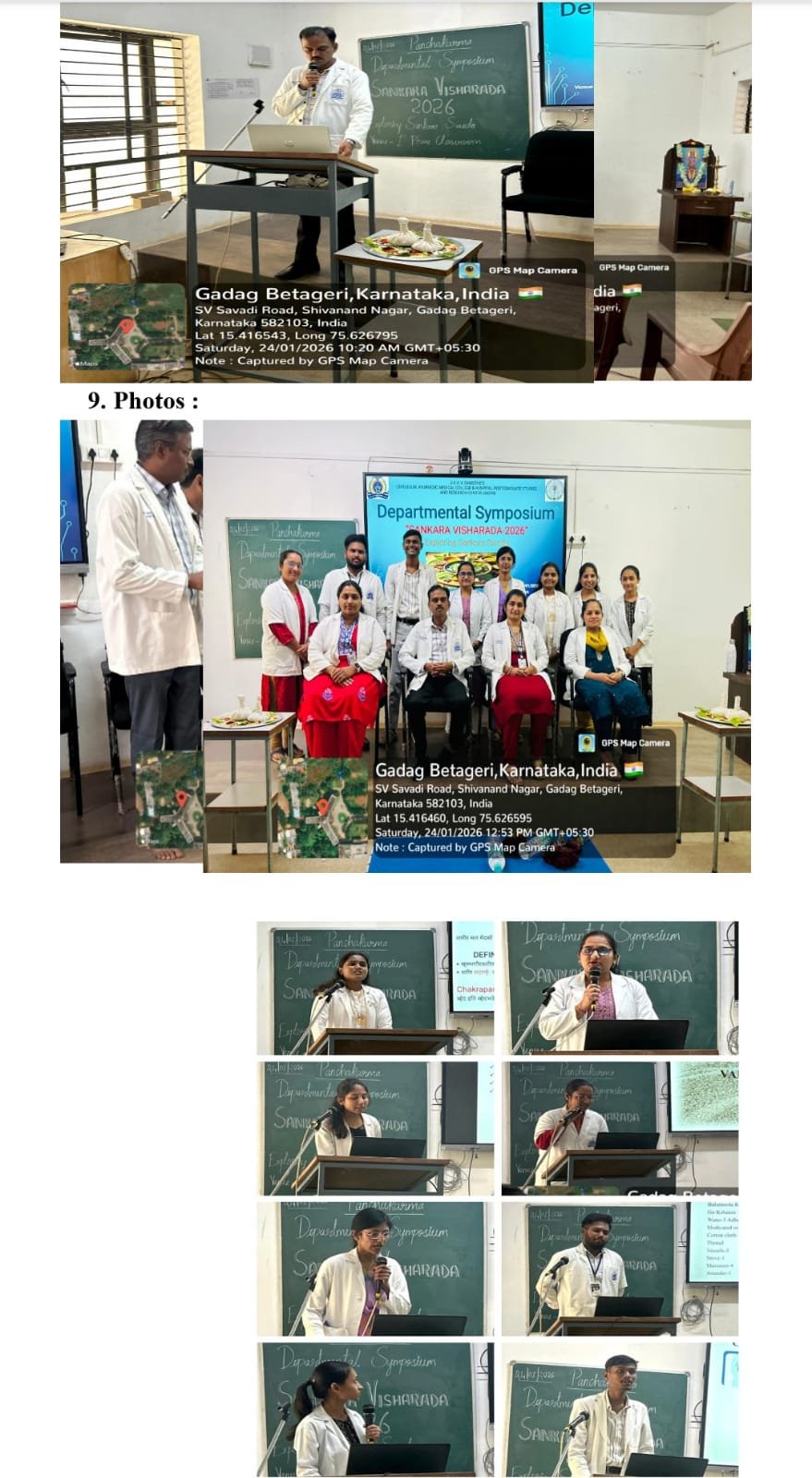 24/01/2026,1. Dr. S.N.Belavadi – President 2. Dr. Jairaj P Basarigidad, Prof & HOD Dept of Panchakarma. 3. Dr. V S Adoor Prof.& HOD Dept of Shalakya Tantra and Final Phase Coordinator 4. Dr. Yasmeen A Panibandh Prof Dept of Kayachikista and PG Coordinator 5. Dr. R V Shetter - First Session Chair Person 6. Dr. Rudresh Devdar – First Session Chair Person 7. Dr. Kumar C – Second Session Chair Person 8. Dr. Sumai M A – Second Session Chair Person All the UG & PG students, HODS & staff of different departments. Symposium by Panchakarma Department Prayer and Dhanvantari sthapana – Miss. Keerthi & Miss. Nandinipriya Key note address – Dr. Jairaj P Basarigidad Welcome speech – Dr Seema and Dr Chaitra Presidential speech – Dr. S N Belavadi Chair Person Remarks – Dr. R V Shetter, Dr. Rudresh Devdar, Dr. Kumar C and Dr. Sumai M Vote of thanks :- Dr. Soumya V Abbigeri. Outcome :- Formal function started with the prayer and inauguration. Key note address was given by the HOD of Dept of Panchakarma and he said about the importance of Sankara and uses of Sankara Sweda. Beloved principal Dr. S.N.Belavadi gave the Presidential Speech and Appreciated students for their sincere effort and encouraged them to involve in more such activities. 1st Presenter: Dr. Chaitra- Introduction, Indication, Contraindication and Types of Swedana. 2nd Presenter: Dr Meghana M- Definition, Classification of Sankara Sweda and its Importance. 3rd Dr Sarswati: Choorna Pinda Sweda, Ishtika Sweda, Tusha Pinda and Gomaya Pinda Sweda. 4th Presenter: Miss Anoksha: Valuka Sweda, Chincha Lavan Pinda Sweda and Lavana Pottali Sweda. 5th Presenter: Dr Shreedevi – Shastika Shali Pinda Sweda, Dhanya Pinda Sweda and Masha Pinda Sweda. 6th Presenter: Mr. Naresh – Goduma, Mamsa, Kukktand Pinda Sweda. 7th Presenter: Dr. Seema Desai – Patra Pottali, Jambeer, and Lasuna Pinda Sweda. 8th Presenter: Dr. Gurukiran D- Complications and Precautions, Mode of action of Swedana, Discussion |
