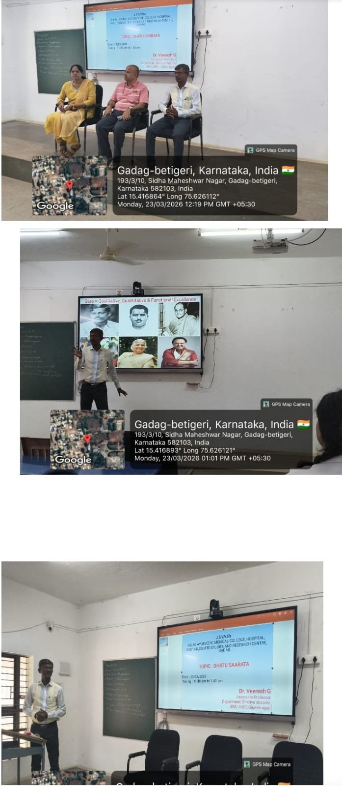 23/03/2026 ,Guest Speaker : Dr.Veeresh Gadagin Associate Professor Dept of Kriya Sharira BMJAMC Gajendragad. Conducted By : Dept of Kriya Sharira Protocol of Programe : • Welcoming of all dignitaries. • A brief formal keynote address by Dr. Anupama R Hiremath Proff & HOD Dept of Kriya Sharira. • Predensitial speech by the principal Dr. S.N. Belavadi • Guest speech regarding the event by Dr. Veeresh Gadagin • Afterwards session was handed over to Dr Veeresh Gadagin and a very informative presentation was given by guest speaker on the subject of Dhatu Saarata • Vote of Thanks Given by Dr. Anupama R Hiremath • Overview of the topic covered are – • Defination of Dhatu Saarata • Explanition about astavidha sara • Examination of Sara purusha • Clinical aspects • Interaction with the students |