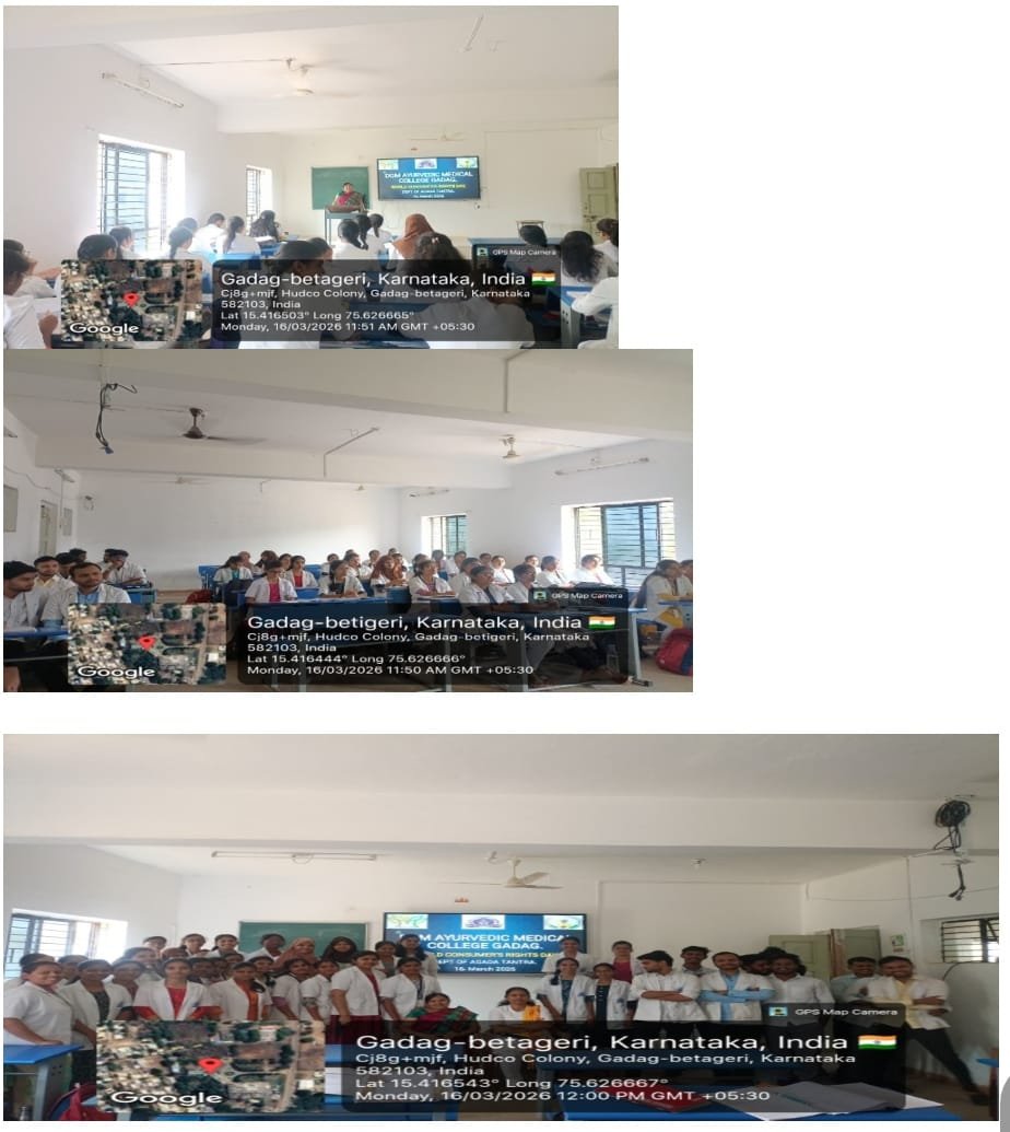 28.03.2026,Theme: "Safe Products, Confident Consumers”... The Department of Agadatantra, D.G.M.A.M.C., Gadag, with the support of Principal Dr. S. N. Belavadi, celebrated World Consumer Protection Day on 16.03.2026 in the 2nd Phase classroom from 11:30 AM to 12:30 PM, in accordance with the 2026 theme "Safe Products, Confident Consumers"..Dr. Jayalaxmi Menasagi, Professor and HOD, Department of Agadatantra, delivered an awareness talk to the students on the history, aims and objectives, theme, consumer rights and responsibilities, the procedure for filing complaints in the consumer forum, and its importance.Dr. T. Vidyavati, Assistant Professor, coordinated the programme. All the 2nd Phase students attended the programme. |