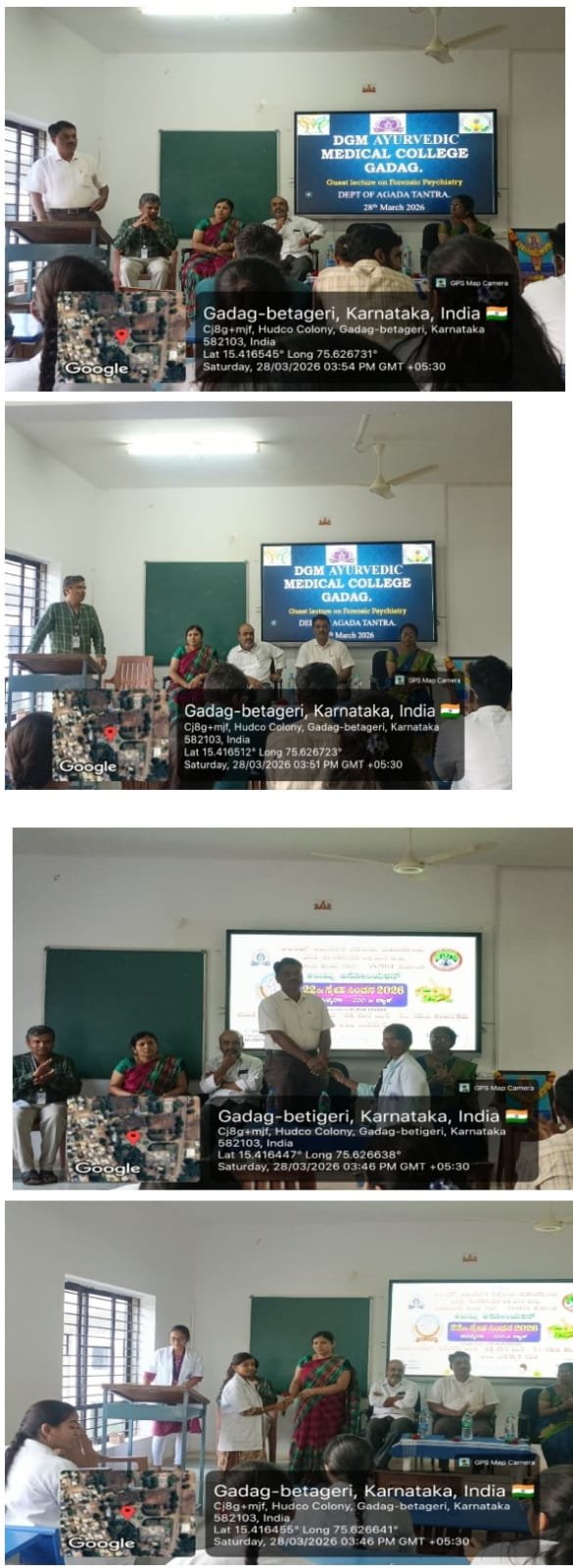 28.03.2026,A guest lecture was organized by the Department of Agadatantra in association with the Sneha Sinchana Alumni 2001 Batch, D.G.M.A.M.C., Gadag, on the topic of Forensic Psychiatry on 28.02.2026, with the support of Principal Dr. S. N. Belavadi. The guest speaker, Dr. Shivaleela Rajur, Professor and HOD, Department of Agadatantra, Grameena Ayurveda Mahavidyalaya, Terdal, delivered an informative talk on forensic psychiatry, its types, and its importance in clinical practice and in the court of law. The President of the programme, Dr. D. G. Kolume, In-charge Principal and HOD, Department of Dravyaguna, spoke about mental illnesses and their consequences in society during his presidential address. The programme began with a prayer song dedicated to Lord Dhanvantari. Dr. Kumar Choudappalavar, Professor, Department of Dravyaguna, delivered the welcome speech. Dr. Jayalaxmi Menasagi, Professor and HOD, Department of Agadatantra, delivered the keynote address. Dr. M. V. Sobagin, Professor and HOD, Department of RSBK and 2nd Phase Coordinator, was present on the dais. Dr. V. S. Adoor and Dr. T. Vidyavati were also present. Miss Veena conducted the anchoring. All the 2nd Phase students attended the event. |