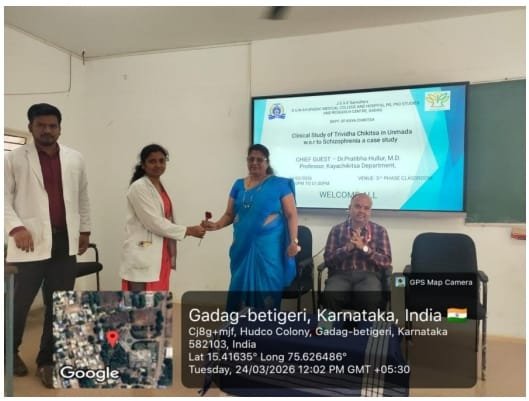 24/03/2025 Tuesday ,The Guest Lecture on Clinical Study of Trividha Chikitsa in Unmada w.s.r to Schizophrenia a Case Study, hosted by Department of Kayachikitsa was conducted. Dr. S. N. Belavadi, Principal of DGM AMC was present as a President of the programme. Dr. Pratibha Hullur Professor Dept of Kayachikitsa, Sanjivini Ayurvedic Medical College Hubli, specialization in Kayachikitsa, was invited as a Guest Speaker. |